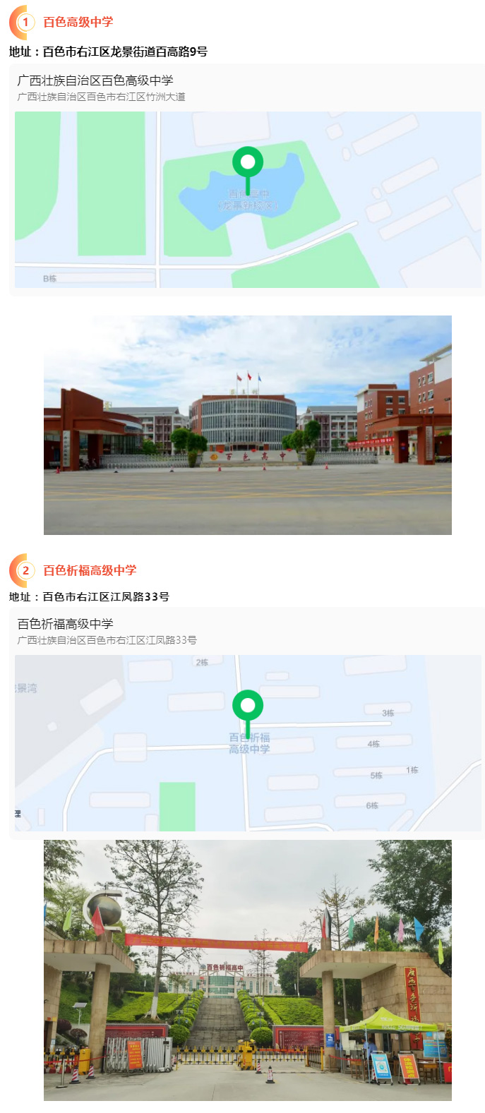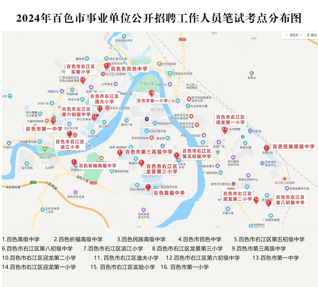 2.請?zhí)崆笆煜た键c地址,做好路線、住宿的安排。本次考試參考人數(shù)較多,考點分布分散,建議考生考前實地察看考點,確認考點入口位置,防止走錯考點。請充分考慮考點周邊交通通行情況和停車場地容量,合理安排出行方式,預留充足時間,確保考試當天按時到達。另外,考試期間百色市及各考點學校周邊的住宿比較緊張,請?zhí)崆邦A定。