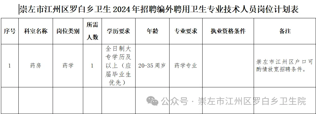 根據(jù)工作需要,結合我院實際情況,江州區(qū)羅白鄉(xiāng)衛(wèi)生院面向社會招聘工作人員。