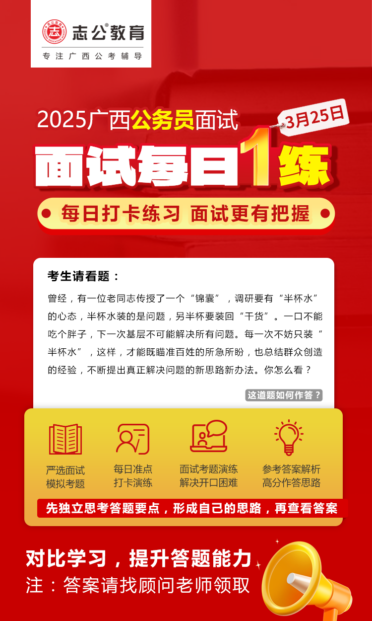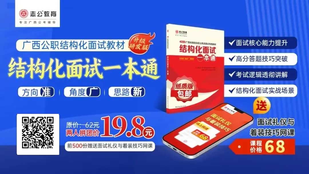 廣西區(qū)考面試準(zhǔn)備需緊扣本土特色,強(qiáng)化邏輯表達(dá)和實(shí)務(wù)能力,同時(shí)注重細(xì)節(jié)(如資格復(fù)審材料、禮儀)。建議從現(xiàn)在起每天練習(xí)2-3套題,持續(xù)積累廣西熱點(diǎn)案例,爭(zhēng)取面試高分!資料已經(jīng)為大家準(zhǔn)備好了,快去看看吧!