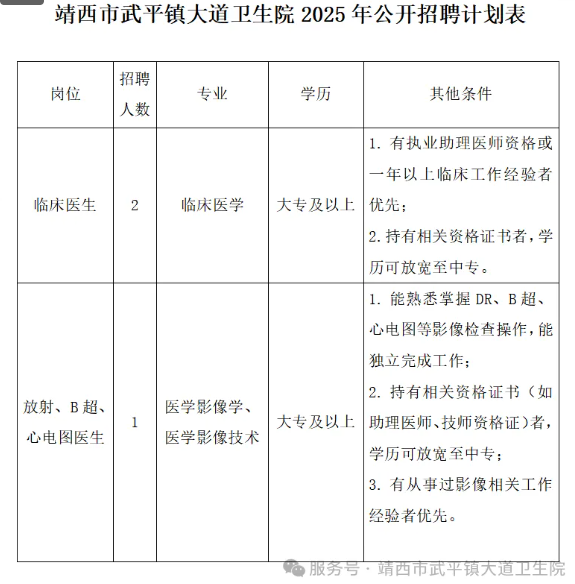 原文標題:靖西市武平鎮(zhèn)大道衛(wèi)生院2025年公開招聘臨床醫(yī)生、影像專業(yè)技術(shù)人員公告!