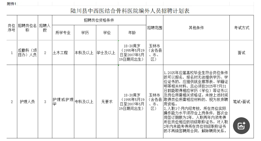 具體相關(guān)專業(yè)崗位條件詳見(jiàn)《陸川縣中西醫(yī)結(jié)合骨科醫(yī)院編外人員招聘計(jì)劃表》(附件1)。