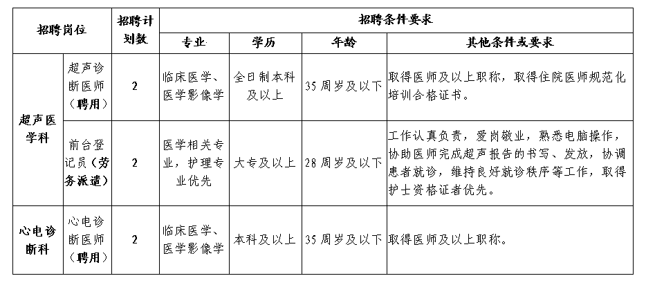 根據(jù)醫(yī)院業(yè)務(wù)發(fā)展需要,特面向社會緊急招聘超聲醫(yī)學(xué)科、心電診斷科工作人員?,F(xiàn)將招聘有關(guān)事項公告如下: