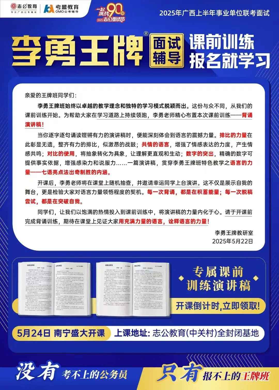 繼志公教育&李勇王牌®班教研室5月17日發(fā)布修改招生規(guī)則的通知后,各位未來“橘”長(zhǎng)們,翹首以盼的時(shí)刻終于來啦!5月24日,志公教育李勇王牌®班——改革后的首個(gè)開班,在南寧火熱啟幕!現(xiàn)場(chǎng)學(xué)習(xí)氣氛爆棚,李勇老師與學(xué)員高頻互動(dòng),學(xué)員們直呼 “學(xué)到停不下來”!這不僅是一場(chǎng)面試特訓(xùn),更是一次思維與能力的雙重蛻變!