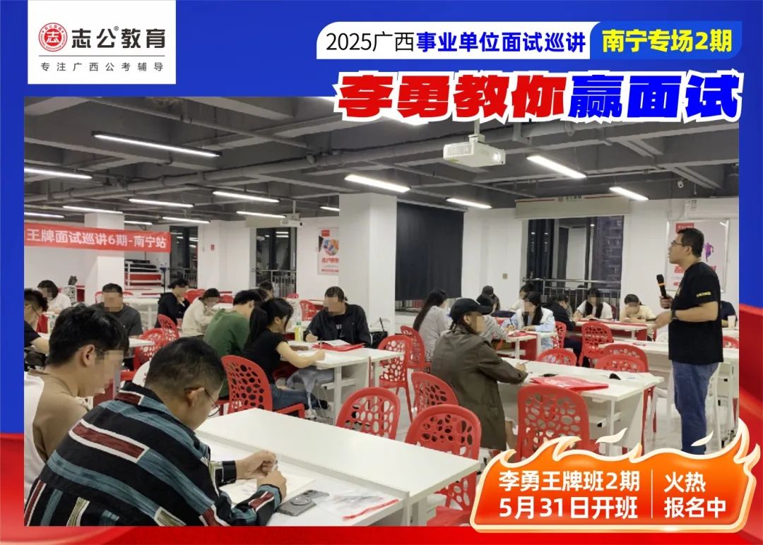 隨著2025廣西事業(yè)單位——李勇教你贏面試【南寧專場2期】線下巡講落幕,這場"面試攻堅戰(zhàn)",不僅點燃了備考熱情,更讓志公教育"幫助人才實現(xiàn)更高質(zhì)量的就業(yè)"的使命,在八桂大地結(jié)出更多碩果。