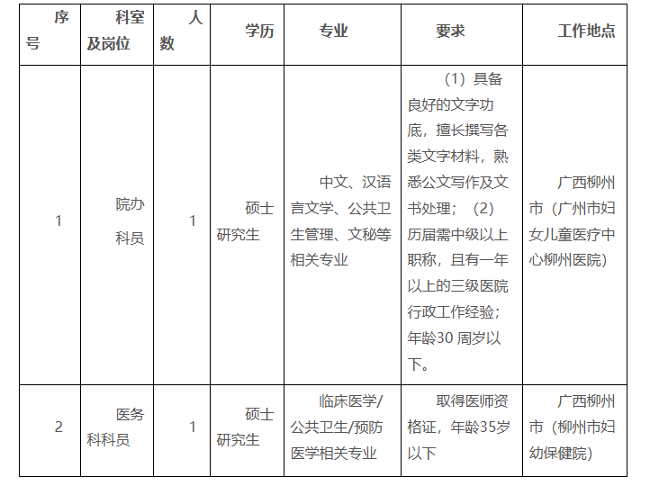 根據(jù)醫(yī)院發(fā)展需要,廣州市婦女兒童醫(yī)療中心柳州醫(yī)院、柳州市婦幼保健院現(xiàn)向社會招聘醫(yī)務科和院辦科員各一名,具體要求如下: