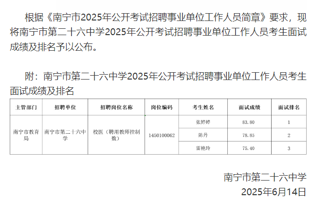 南寧市第二十六中學(xué)關(guān)于公布2025年公開考試招聘事業(yè)單位工作人員考生面試成績(jī)及排名的公告