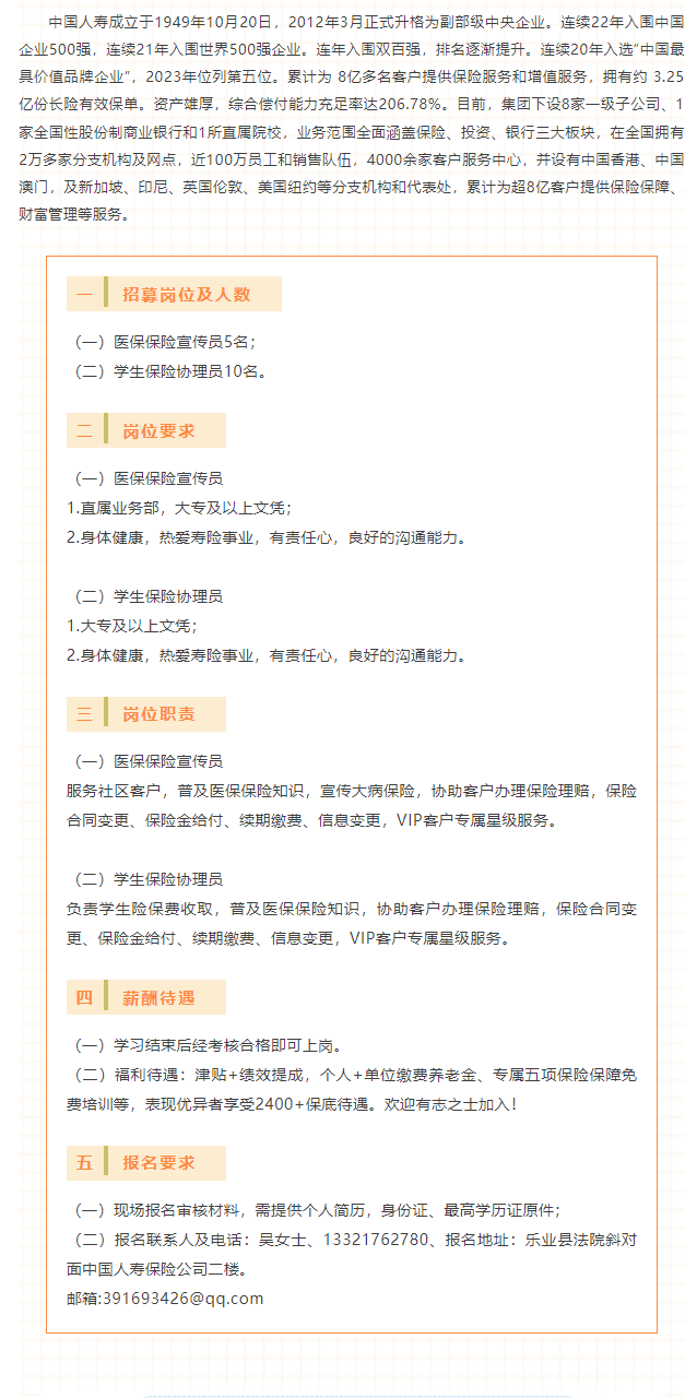 中國(guó)人壽保險(xiǎn)股份有限公司樂業(yè)支公司招募工作人員15名