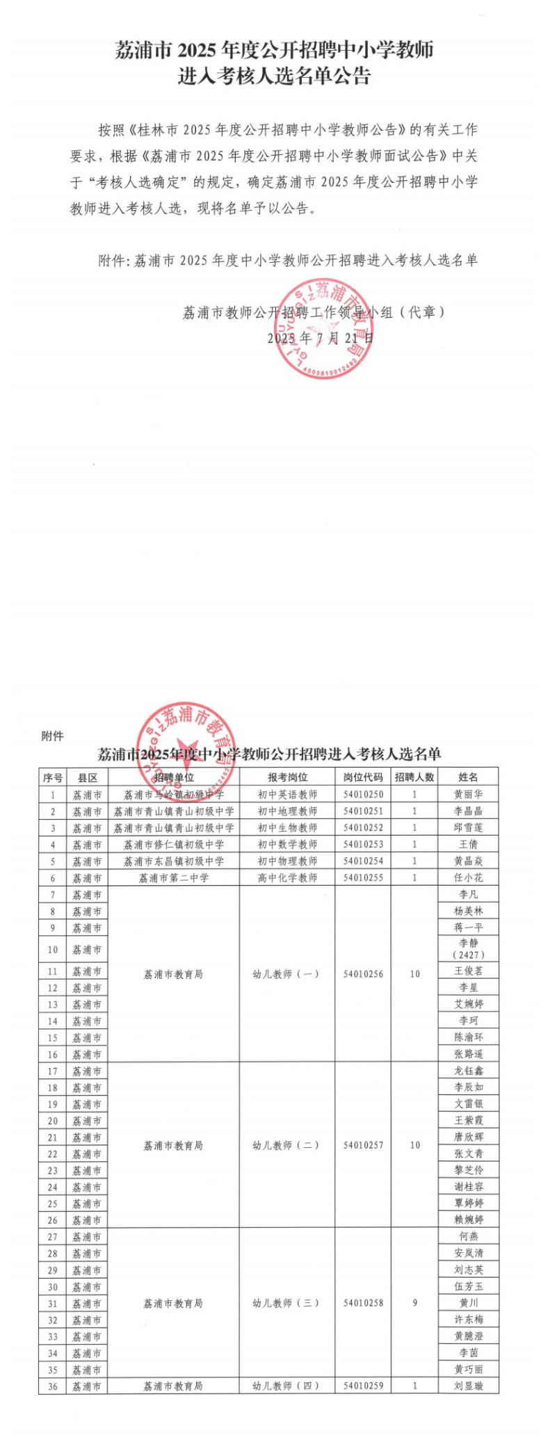 荔浦市2025年度公開招聘中小學(xué)教師進入考核人選名單公告