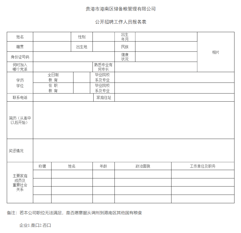 附件:貴港市港南區(qū)儲備糧管理有限公司公開招聘工作人員報名表