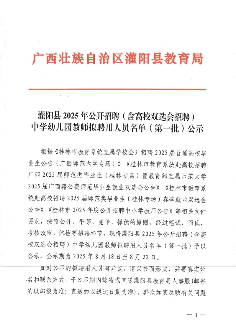 原文標(biāo)題:灌陽縣2025年公開招聘(含高校雙選會(huì)招聘)中學(xué)幼兒園教師擬聘用人員名單(第一批)公示
