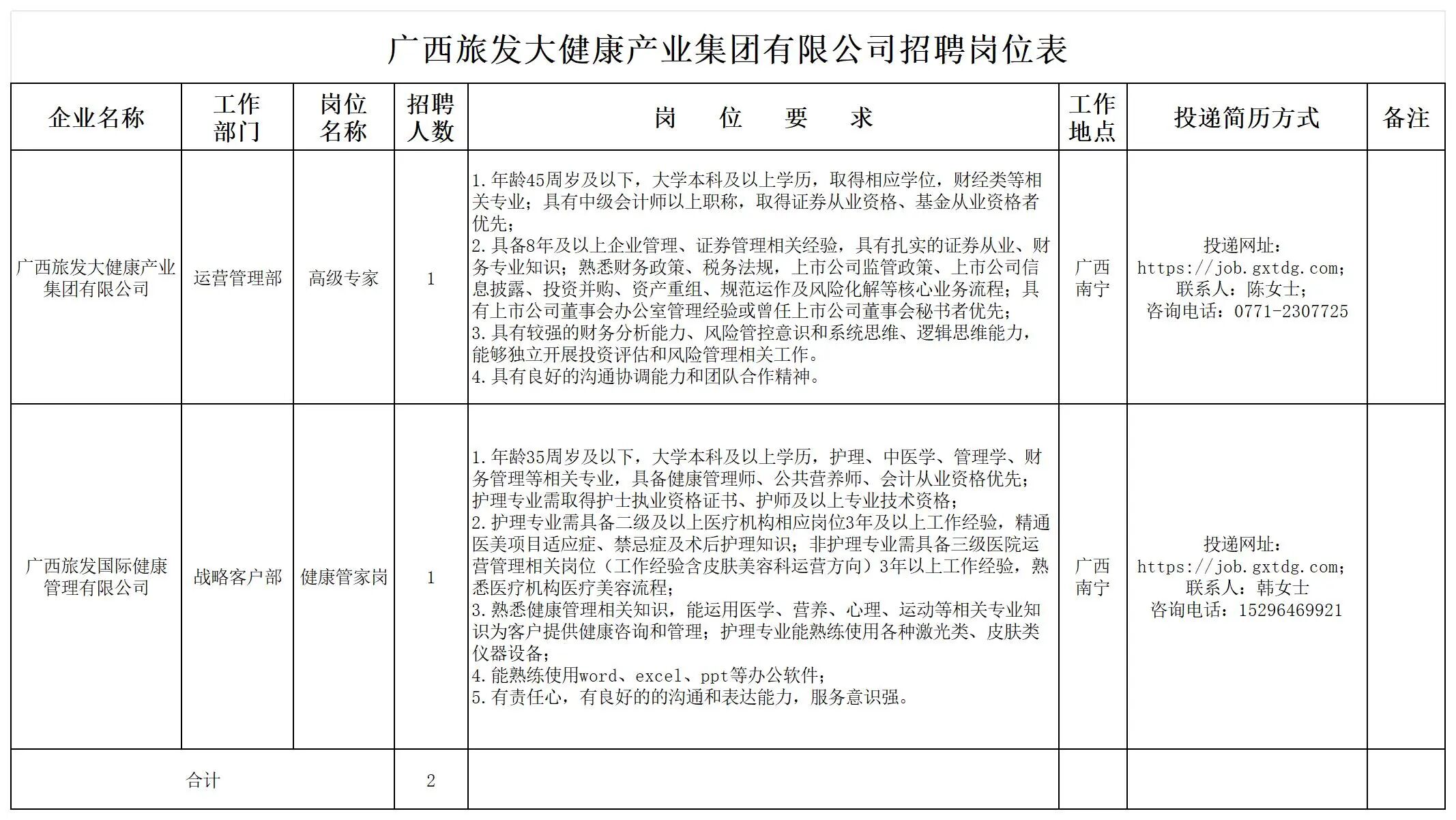 廣西旅發(fā)大健康產業(yè)集團有限公司有關崗位員工2名(詳見招聘崗位表)。