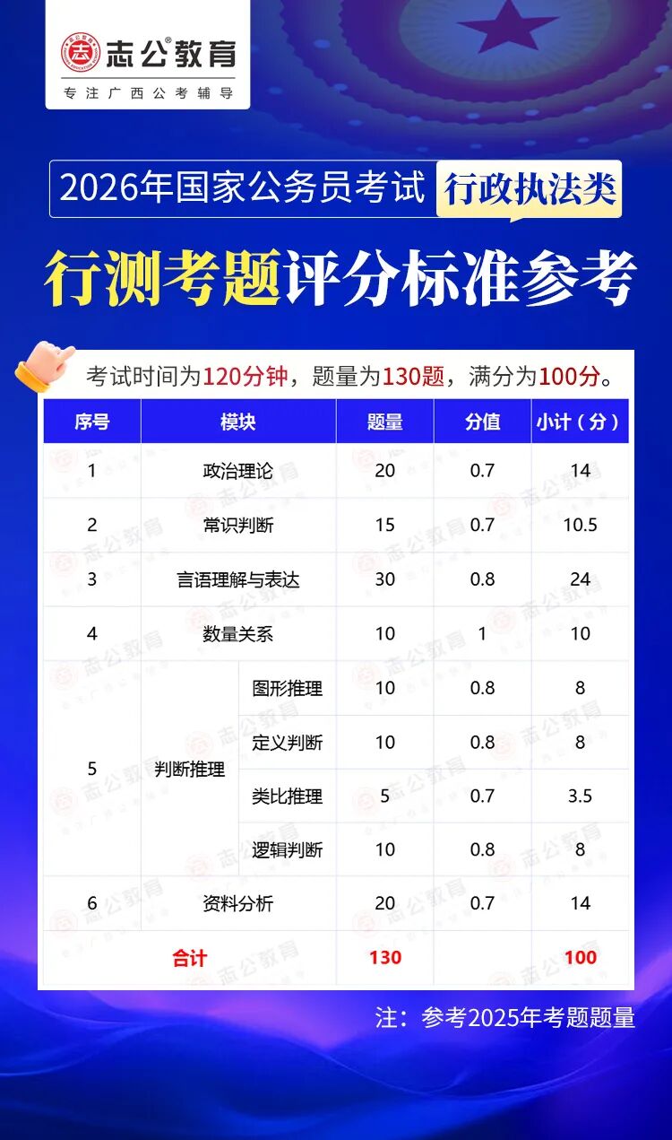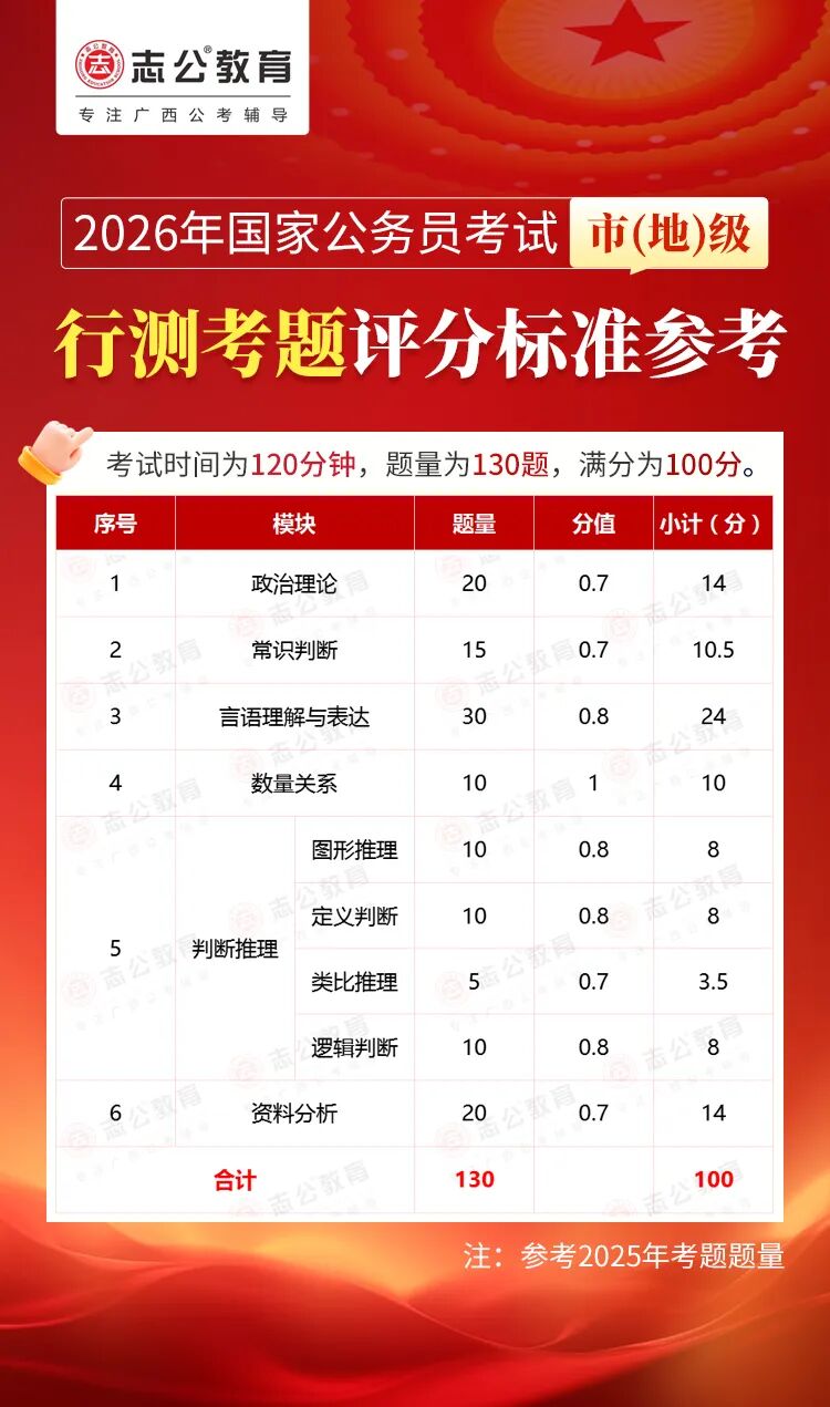 無論報(bào)名人數(shù)是否會(huì)增加,提升自身實(shí)力才是應(yīng)對(duì)2026年國(guó)考的關(guān)鍵。行測(cè)作為國(guó)考公共科目筆試的核心模塊,不僅分值占比高(通常為 100 分),更是考生之間拉開分差的關(guān)鍵戰(zhàn)場(chǎng)。它并非單純考查知識(shí)儲(chǔ)備,而是通過言語理解、判斷推理、數(shù)量關(guān)系、資料分析、常識(shí)判斷、政治理論六大板塊,綜合評(píng)估考生的信息處理速度、邏輯思維能力、應(yīng)急決策水平等綜合素質(zhì)。
