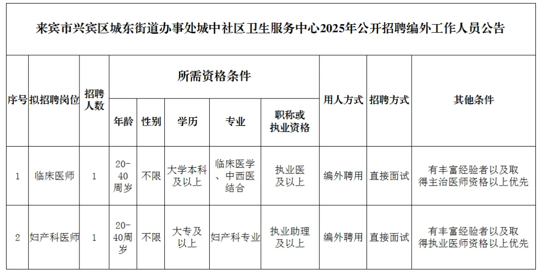 2025年來賓市興賓區(qū)城中社區(qū)衛(wèi)生服務中心公開招聘編外工作人員公告