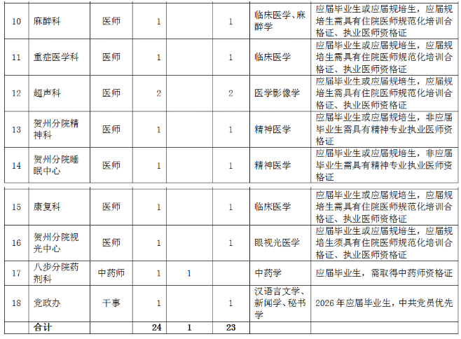 (應(yīng)聘報(bào)名二維碼)同時(shí),按以下要求提供個(gè)人應(yīng)聘材料(電子版)發(fā)電子郵箱:gdyy2817726@163.com(郵件主題請(qǐng)標(biāo)明:“姓名+賀州兩分院”字樣)。應(yīng)屆畢業(yè)生:個(gè)人簡(jiǎn)歷、身份證、就業(yè)推薦表、成績(jī)單、各種獎(jiǎng)項(xiàng)獎(jiǎng)勵(lì)證書、外語等級(jí)證書等。非應(yīng)屆畢業(yè)生:個(gè)人簡(jiǎn)歷、身份證、畢業(yè)證、畢業(yè)證備案登記表、學(xué)位證、學(xué)位證備案登記表、職稱證、執(zhí)業(yè)證、住院醫(yī)師規(guī)范化培訓(xùn)合格證、工作證明等。報(bào)名時(shí)所提交的申請(qǐng)材料必須真實(shí)、準(zhǔn)確,因報(bào)名時(shí)提交的申請(qǐng)材料不真實(shí)、不完整或錯(cuò)誤填寫報(bào)名信息,造成資格審查、面試資格審查不通過的,后果由報(bào)名人員自行承擔(dān)。(2)資格審核。人事科依據(jù)招聘公告和用人需求規(guī)定的資格條件對(duì)應(yīng)聘人員簡(jiǎn)歷進(jìn)行收集和資格初步審查,經(jīng)招聘工作領(lǐng)導(dǎo)小組審核后,確定符合崗位條件報(bào)名人員名單,由醫(yī)院人事科電話或短信通知符合條件人員。(3)考核??己斯P試和面試由人事科負(fù)責(zé)組織實(shí)施,協(xié)助部門為醫(yī)務(wù)部、護(hù)理部、科教科以及用人科室,紀(jì)律監(jiān)督部門為監(jiān)察室。逾期未參加則視為自愿放棄。(4)試工。通過考核的非應(yīng)屆畢業(yè)應(yīng)聘人員,須到醫(yī)院試工5天。試工不通過,不予聘用。(5)體檢。體檢工作由廣西壯族自治區(qū)桂東人民醫(yī)院按照有關(guān)規(guī)定統(tǒng)一組織。體檢標(biāo)準(zhǔn)參照《廣西壯族自治區(qū)事業(yè)單位公開招聘人員體檢通用標(biāo)準(zhǔn)(試行)》《廣西壯族自治區(qū)事業(yè)單位公開招聘人員體檢操作手冊(cè)(試行)》執(zhí)行。體檢不合格或隱瞞真實(shí)情況致使體檢結(jié)果失真的,不予聘用。因體檢不合格空缺崗位的,將按考核的綜合成績(jī),從高到低,順位補(bǔ)充體檢人員。(6)公示和聘用。對(duì)擬聘非應(yīng)屆畢業(yè)應(yīng)聘者在全院范圍內(nèi)進(jìn)行公示,公示期為5個(gè)工作日,公示期滿無異議按程序辦理聘用手續(xù)。對(duì)公示有異議,經(jīng)核實(shí)影響聘用的,取消其聘用資格;對(duì)反映問題難以核實(shí)的暫緩聘用,待核實(shí)清楚后按有關(guān)規(guī)定辦理。