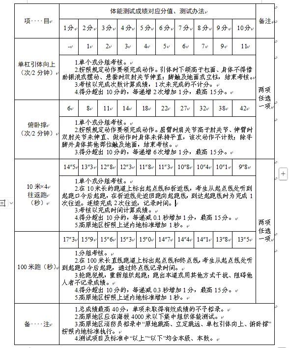 2.體能測試:(1)必考項(xiàng)目:1000米跑;(2)選考項(xiàng)目:①立定跳遠(yuǎn)、原地跳高二選一;②單杠引體向上、俯臥撐二選一;③10米×4往返跑、100米跑二選一;(3)注意事項(xiàng):體能測試有兩項(xiàng)及兩項(xiàng)以上不得分的視為不合格(標(biāo)準(zhǔn)參照附件)。未按時(shí)參加或因身體原因無法測試者,視為自動(dòng)放棄。