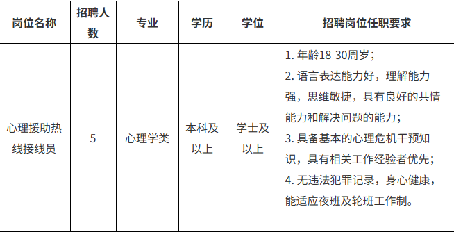 醫(yī)院承接“12356全國統(tǒng)一心理援助熱線”,提供24小時(shí)不間斷服務(wù)模式,由專職心理咨詢師、心理治療師及精神科醫(yī)護(hù)人員組成專業(yè)團(tuán)隊(duì),為來電者提供心理教育、心理咨詢、危機(jī)干預(yù)及心理健康科普服務(wù),覆蓋情緒舒緩、家庭關(guān)系、青少年心理咨詢等多類問題,為自殺高危人群提供快速響應(yīng)與轉(zhuǎn)介服務(wù)。為進(jìn)一步提升心理服務(wù)質(zhì)量、補(bǔ)充現(xiàn)有接線員力量,為公眾提供更優(yōu)質(zhì)、專業(yè)、高效的心理健康服務(wù),現(xiàn)面向社會(huì)招聘5名接線員。