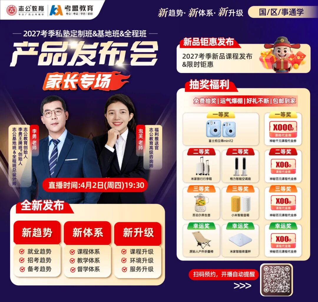 面對孩子棘手的就業(yè)與考公難題,家長們往往深感無力。針對這一系列關(guān)切的痛點(diǎn),志公教育于4月2日(周四)19:30舉辦“新趨勢·新體系·新升級——2027考季公考產(chǎn)品發(fā)布會”重磅直播,從專業(yè)的角度分析解讀當(dāng)前就業(yè)、招考、備考的新趨勢,為廣大學(xué)子及家長送上備考的“及時雨”,滿足家長和學(xué)子們對獲得更優(yōu)質(zhì)的學(xué)習(xí)環(huán)境、課程體系、督學(xué)服務(wù)、教學(xué)成果的期待。同時直播間免費(fèi)送出更多超值福利。