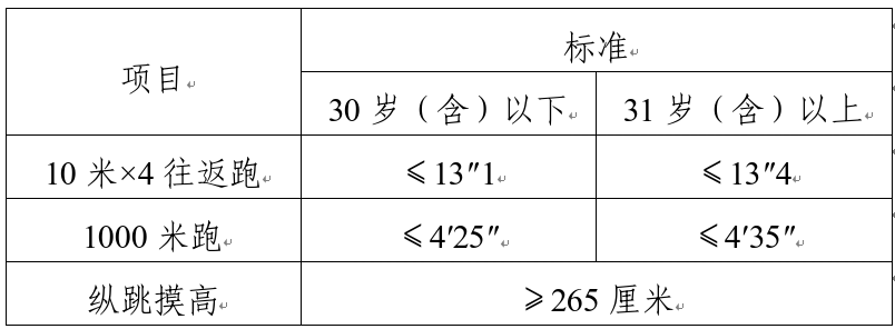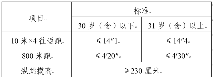 綜合管理類、執(zhí)法勤務(wù)類職位測查全部三個(gè)項(xiàng)目,三項(xiàng)全部達(dá)標(biāo)方為合格;警務(wù)技術(shù)類職位免予測查1000米(男)/800米(女)跑項(xiàng)目,其他兩項(xiàng)全部達(dá)標(biāo)方為合格;報(bào)考外語及少數(shù)民族語言翻譯緊缺職位的人員,體能測評(píng)三項(xiàng)中有兩項(xiàng)達(dá)標(biāo)的,視為合格。
