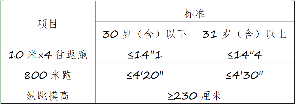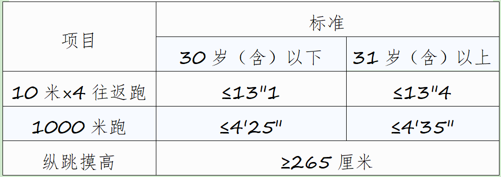 年齡計算時間截止到參加體能測評當月。體能測評項目中,10米×4往返跑項目每人最多可測2次,男子1000米跑(女子800米跑)項目每人最多可測1次,縱跳摸高項目每人最多可測3次。1次測評達標,即視為該項目測評合格。體能測評所需的場地環(huán)境和器材,結合測評地點的實際情況設置。